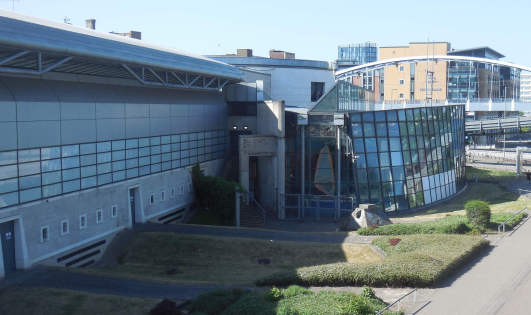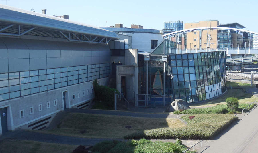 To our right is Ponds Forge International Sports Centre, opened in 1991 as a venue for the Summer Universiade, which the city hosted that year. The Centre boasts a wide variety of facilities, from a competition standard pool to group exercise studios. The venue has also hosted opera. The name Ponds Forge is borrowed from the steel works that formerly occupied this site and the natural ponds that were in this area.