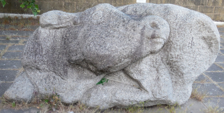 Follow the steps up to see the Sacred Cow artwork by Ronald Rae. A plaque on a nearby wall states that this piece was chosen by school children of Sheffield. It is a large cow cut from a single block of granite. It lies with its head facing back over its haunches. It is a frontal piece in design and hardly interfered with.