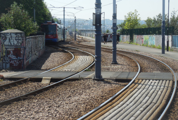 A bridge carries the tram tracks and a footpath over a section of the Park Square roundabout. Here the lines diverge; one line continues to Meadowhall while the other heads southwards to Manor Top