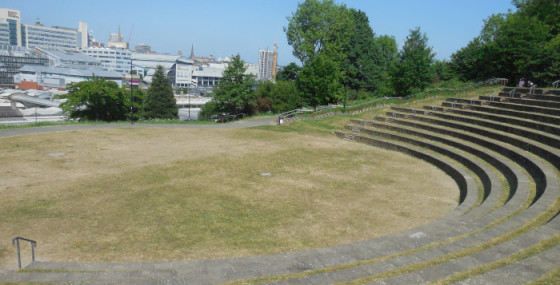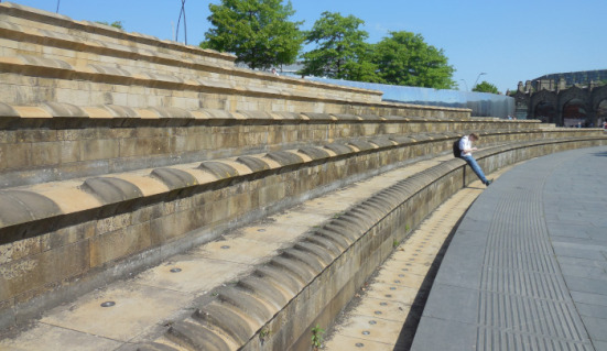 Behind this stop go up the steel steps to an amphitheatre built into the South Street Park hillside as part of an £800,000 plan to regenerate the area behind Sheffield Midland station and create a green corridor from Victoria Quays to Norfolk Park. The amphitheatre seats 1000 and has been used to host performances of Shakespeare.
