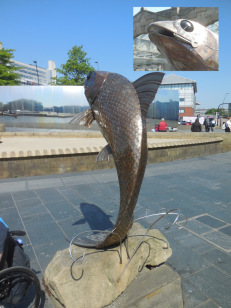 On the quayside stands Heron and Fish by Vega Bermejo commissioned by Sheffield City Council for the 1995 Stone Symposium. The heron carries a large fish in its bill. Admire the balance and