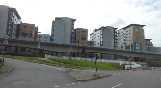 Leaving Victoria Quays and following Blast Lane, the path is severed by the Sheffield Parkway, but there is a subway through to the Broad Street end. Nowadays there is an apartment cluster behind the viaduct.