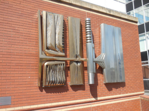 Brian Asquith’s striking 1965 stainless steel and bronze artwork Elements-Fire-Steel. It symbolises the making of steel by means of fire and mechanical means using the Earth’s elements and