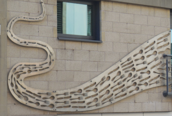 Street where the façade shows references to the Cutlery Trade and the flowing rivers that provided the power.